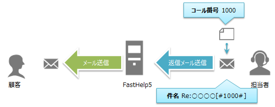 顧客が 2. で FastHelp5 より返信されたメールに対して、メール返信した場合、メールの件名に "オリジナルの件名+[#コール番号#]" が設定されたまま返信されます。 FastHelp5 は "[#" および "#]" で囲まれた数字が件名に含まれていた場合、継続した内容のメールであると判断し、自動的に前回メールを親コールとして 関連付けを行います。