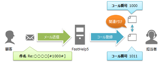 この時に、受信したメールの件名に、前回受信したメールの [コール番号] が、FastHelp5 既定のフォーマットで記載されている場合は、前回の問い合わせに対しての再問い合わせとみなし、自動で、前回の問い合わせコールとの関連付けを行います。