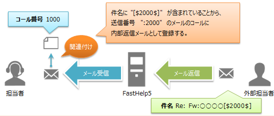 - 顧客からの返信メールに "[$送信番号$]" が含まれていない場合は、FastHelp5 は内部受信としての登録は行いません。コールとして登録します。