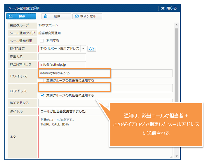 - 表の中には、通知先として "[業務グループ詳細] - [メール通知設定] - [メール通知設定詳細] ダイアログで指定されたメールアドレス" という記述があります。この "メールアドレス" は、次のイメージでオレンジ色の枠で囲った部分に指定されたメールアドレスを意味します。