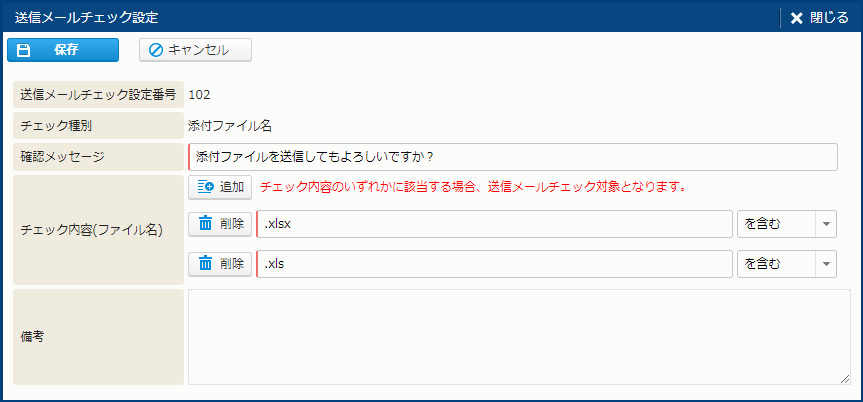 [送信メールチェック設定] では、確認が必要なメールアドレス、添付ファイル名を条件指定することができます。