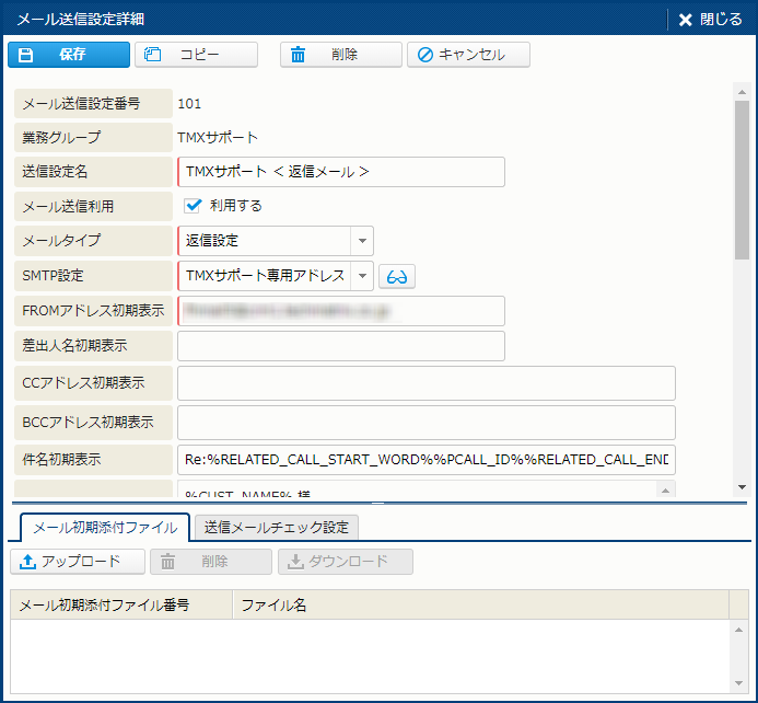 [コール詳細] 画面で返信や転送、内部受信転送を指定したときにデフォルトで利用する送信設定を指定しておきたい場合に設定します。