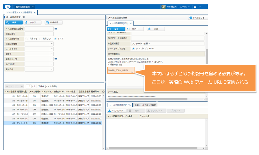 - アンケート連絡メールの本文には、必ず Web フォームの URL を表す予約記号 %WEB_FORM_URL% を含めてください。この部分が実際の URL に変換されて送信されます。