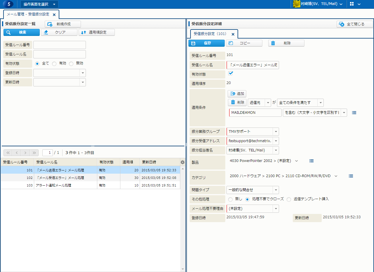 | 振分担当者名 | - | 選択リスト | - | 受信ルールが適用された場合に振り分け先となる担当者。 [振分業務グループ] で選択された業務グループに所属する担当者より選択が可能。 |