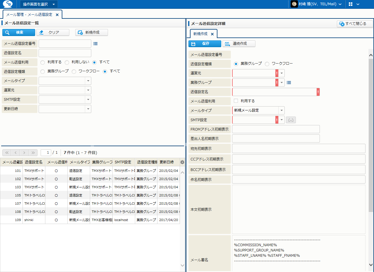 | メール署名 | 4000 | テキスト入力 | - | 送信メールの署名。システム環境変数 DEFAULT_MAIL_SIGNATURE の内容が初期値として入る。 メール予約記号を利用することができる。