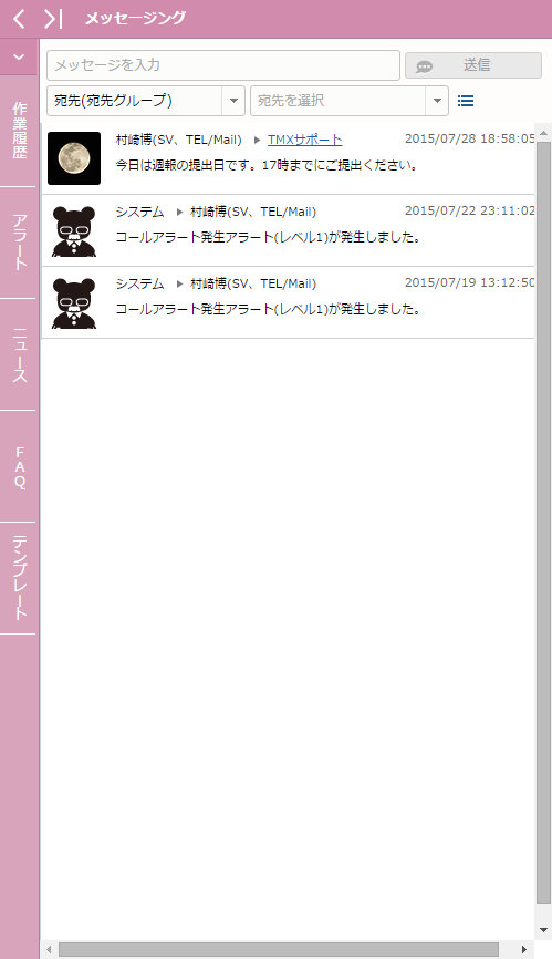 | 宛先種類 | - | 選択リスト | - | メッセージを送信する宛先種類を選択する。"担当者"、"SV"、"業務グループ"、"宛先グループ" から選ぶ。 |