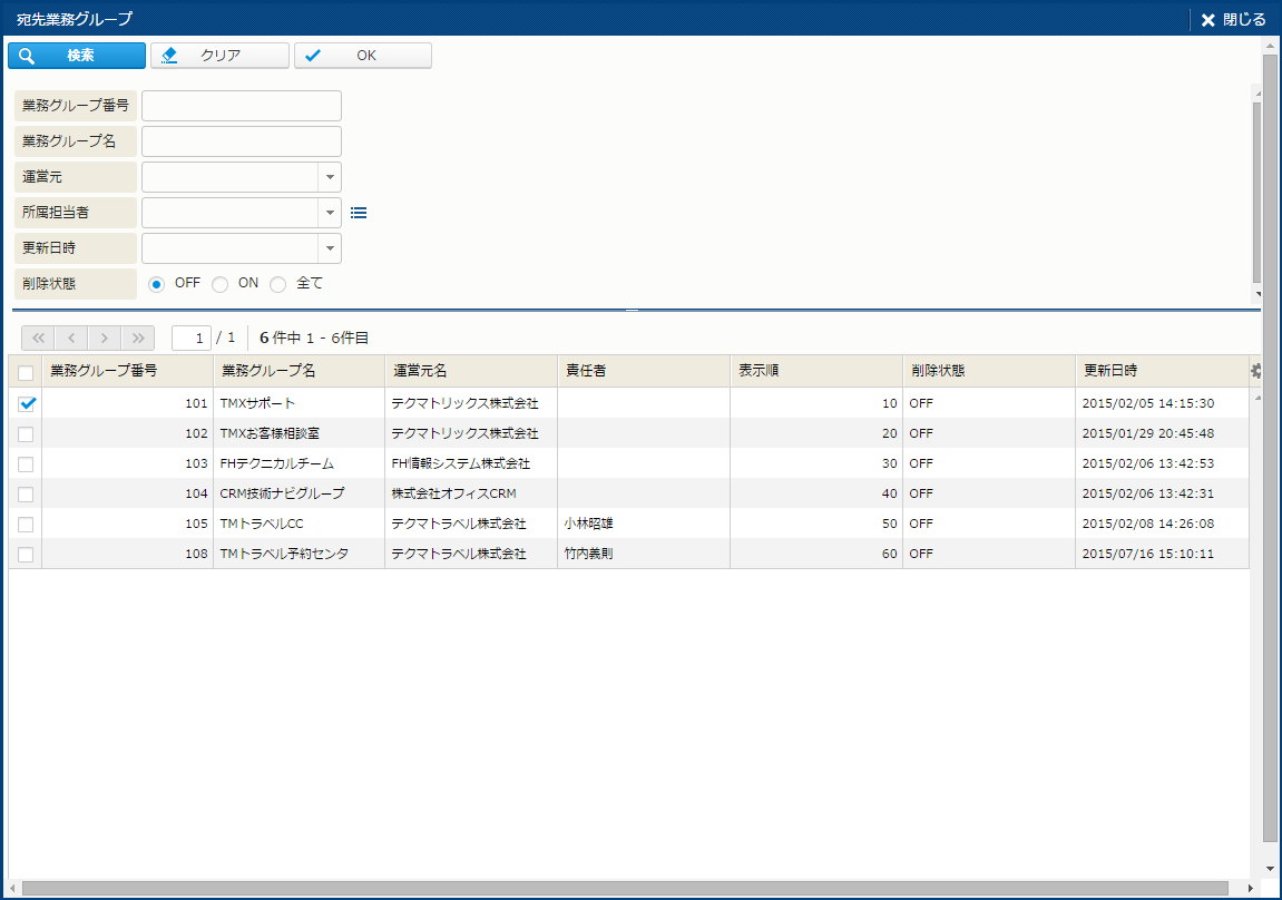 | 検索 | 宛先業務グループを検索する。 | - |
