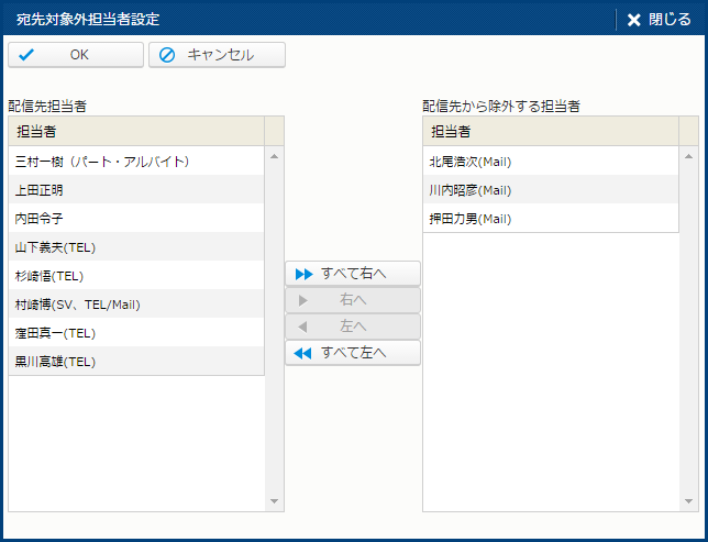 | 左へ | 現在除外中の担当所を配信先に戻す。 | - |