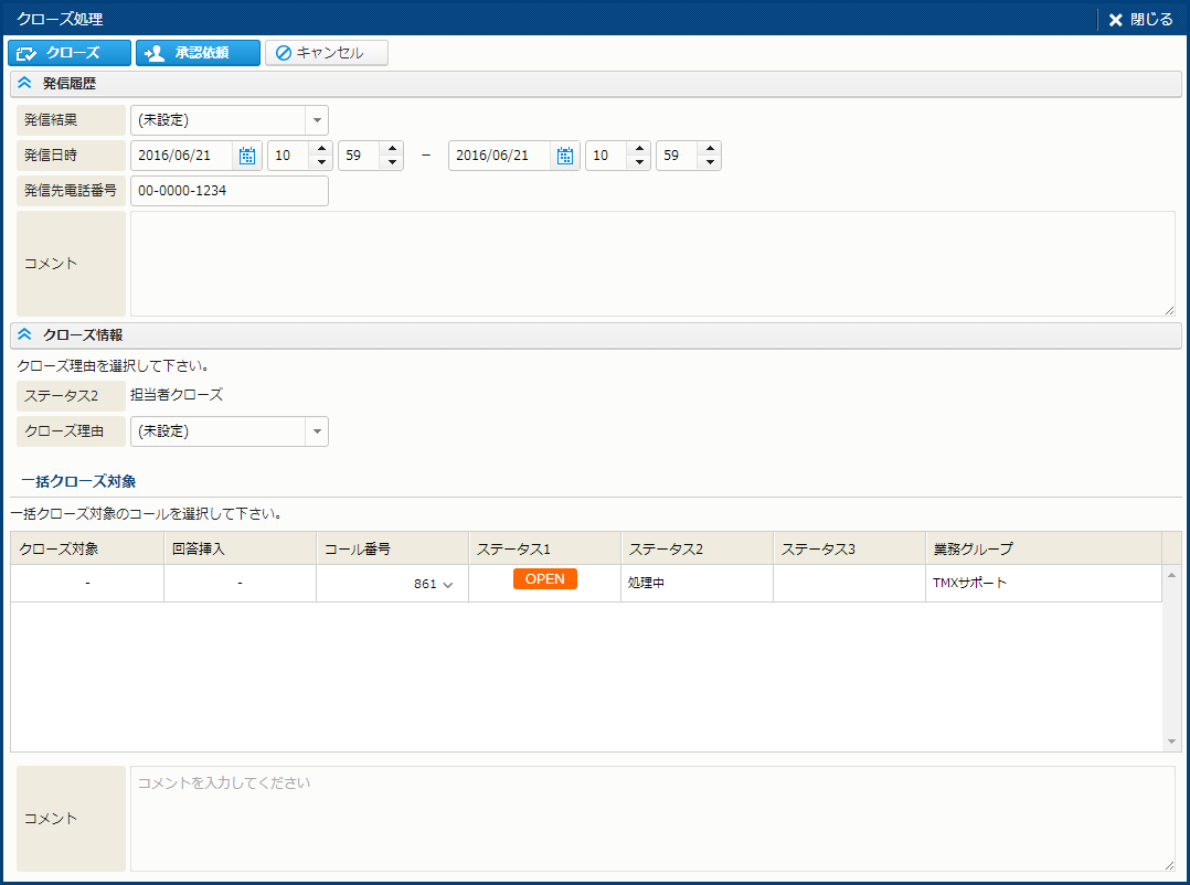 | クローズ | クローズ処理を実行する。 | コールクローズ権限 |