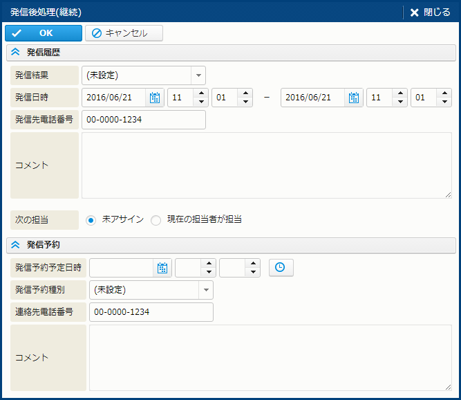 | 発信結果 | - | - | - | "お客様と直接お話しできました" など、発信の結果を選択する。[マスタ管理] - [コードデータ] で指定した値が選択肢として表示される。 |