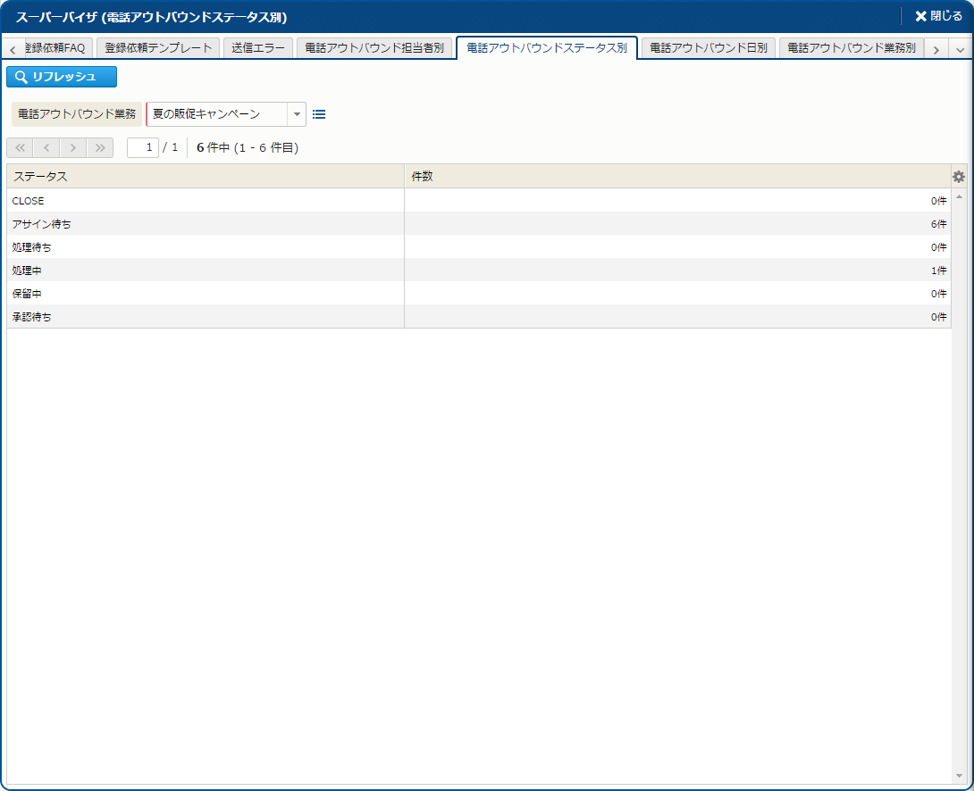 | ステータス | 次の 6 つのステータス別にコール数が表示される。行を選択すると [検索結果] という詳細な一覧が表示される。