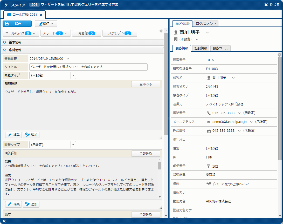 | 関連顧客 | - | - | - | 問い合わせに関連する顧客の名前。コールに設定されている顧客以外に関連する顧客を設定する。 [対象顧客] は、[顧客検索] サブウィンドウで検索して設定することや[顧客詳細] サブウィンドウで顧客の編集ができる。