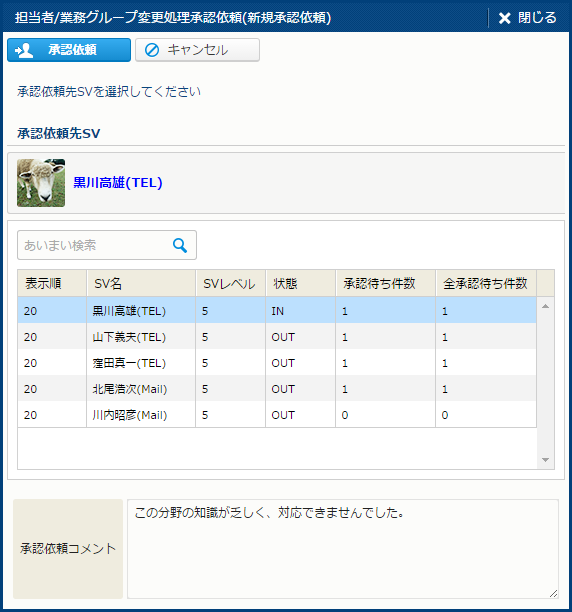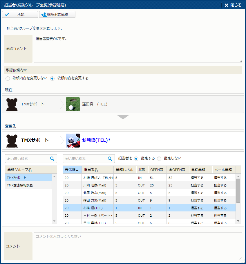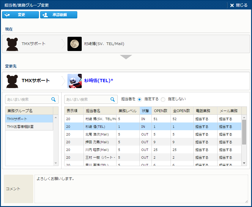 | ガイドメッセージ | "担当者を変更します。変更先を指定してください。" というメッセージが表示される。 |