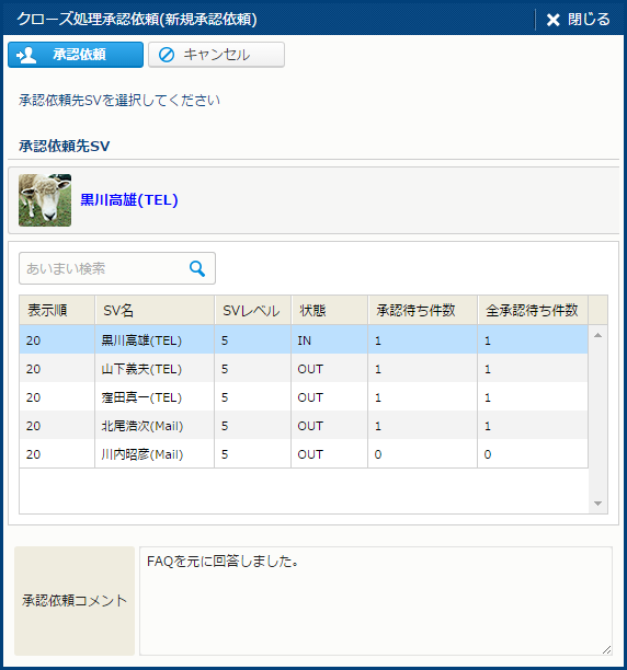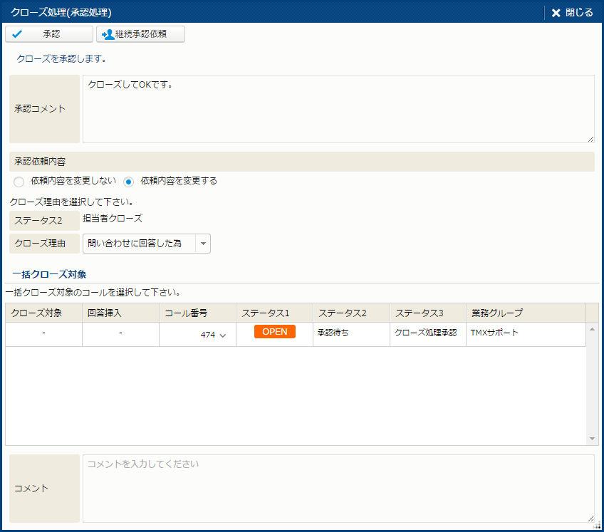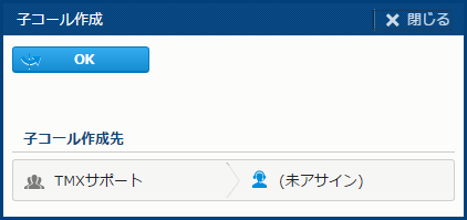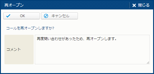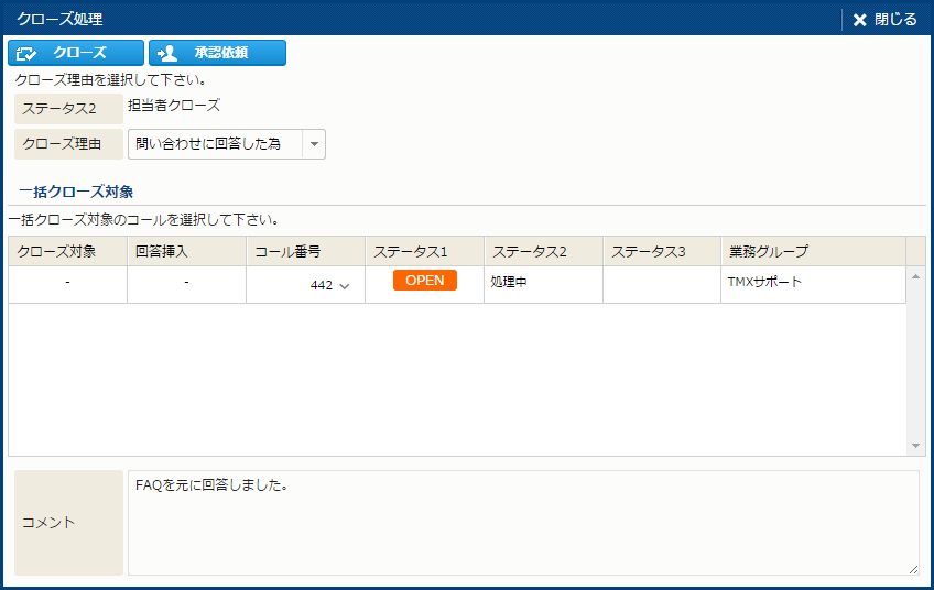 | 操作 | クローズ | コールをクローズする。[クローズ処理] サブウィンドウを開く。 | コールクローズ権限 |