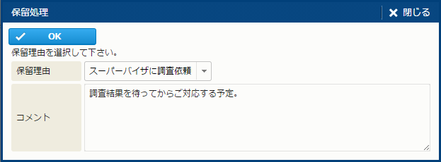 | 操作 | 保留 | コールのステータスを保留状態に変更する。 [保留処理] サブウィンドウを開く。 |