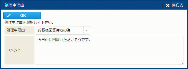 | [対応済日時] の [時計] アイコン | アイコンをクリックすると、[現在日時を設定]、[30分後を設定]、[1時間後を設定]、[2時間後を設定]、[クリア] が選択できる。 | - |