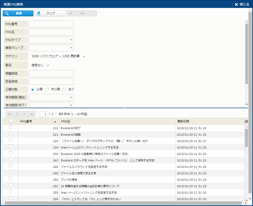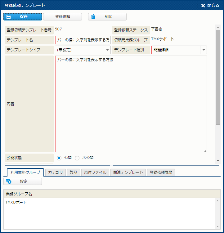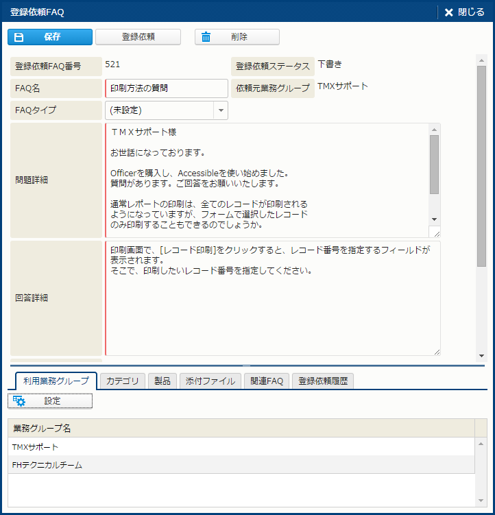| 製品 | - | - | - | 問い合わせの対象となる製品。 [製品]・[子製品] は、ツールチップダイアログや[製品検索] サブウィンドウで検索して複数件設定することができる。 設定した[製品]、[子製品]は、[製品詳細] サブウィンドウで参照できる。 選択した製品から [FAQ] [問題テンプレート] [回答テンプレート] を検索できる。