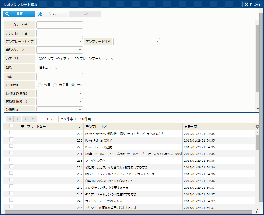 - 「マスタ管理共通エリア - マスタ管理共通エリア - [製品検索] サブウィンドウ」