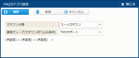 | コールカテゴリ | - | - | - | コールカテゴリ。最大 5 階層までのカテゴリを、ツールチップダイアログ、または [カテゴリ検索] サブウィンドウで複数件設定できる。 複数件設定したカテゴリは、[表示順設定] サブウィンドウで表示順を変更できる。 選択したカテゴリから [FAQ] [問題テンプレート] [回答テンプレート] を絞り込むことができる。 "コールカテゴリ" 以外にも、業務グループに設定したカテゴリ分類がある場合は、その分類名もこの項目の下に表示される。