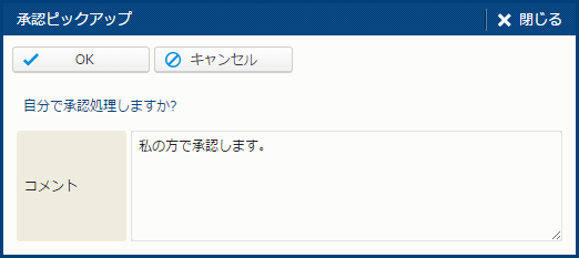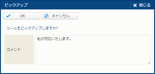 | ピックアップ | - | コールの [現在担当者] を自分に変更する。 このボタンは、1) ワークフローステップが未アサイン状態、かつ 2) ログイン担当者が現在のステップに対応するワークフローステップ割当の割当役職、割当担当者に含まれる場合に表示される。クリックすると、[ピックアップ] サブウィンドウが表示される。 |