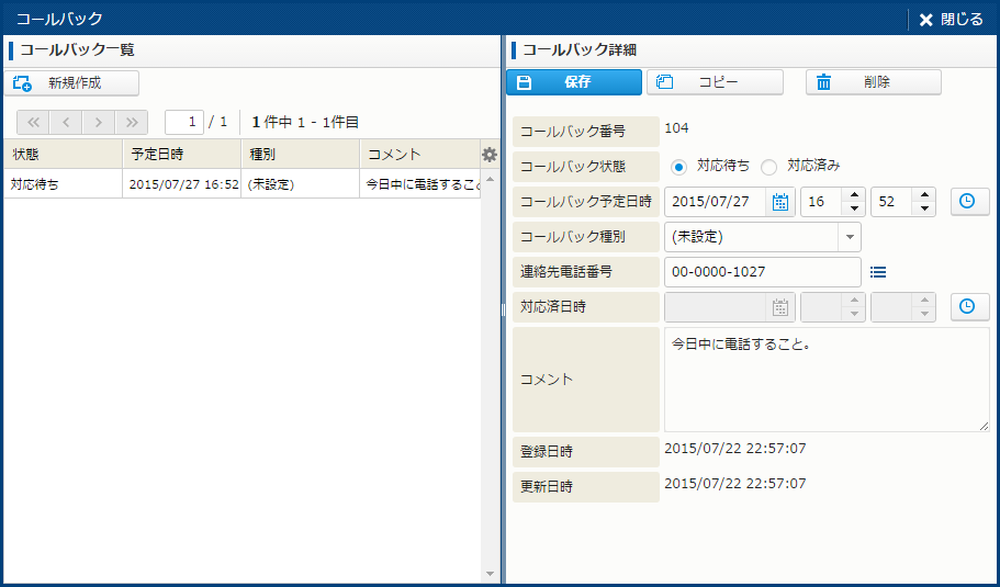 | 登録日時 | - | テキスト入力、カレンダ、時間 | 日時形式 (例:2014/02/25 17 26 50) | 問い合わせを受け付けた日時。コールの新規作成時に、自動で日時が設定される。 日付形式のテキスト入力または、カレンダからの日付選択や "現在日時" "30 分後" "1 時間後" "2 時間後" を選択し設定できる。 |