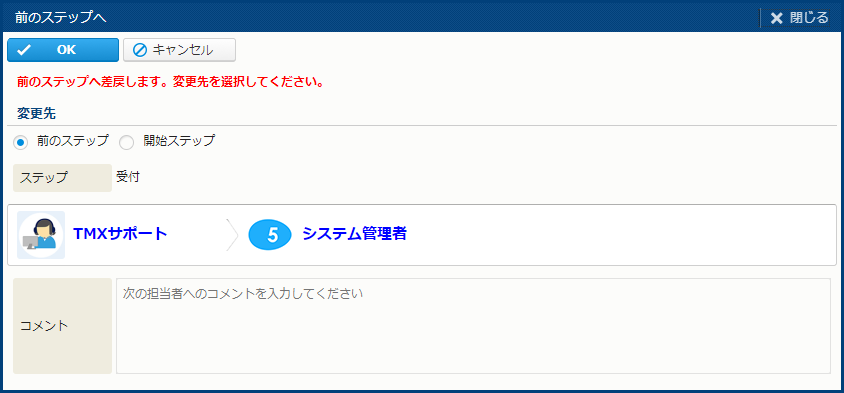 | ガイドメッセージ | "前のステップへ差戻します。変更先を選択してください。" というメッセージが表示される。 |