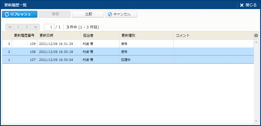 | 比較 | 2 件の更新履歴を選択すると表示されるボタン。2 つの更新履歴を比較する。[比較] サブウィンドウが表示される。 | - |
