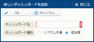 | ダッシュボード種別 | ダッシュボードの種別を指定する。"システム共通"、"担当者"、 "システムロール" のいずれかを選ぶ。 編集権限のない種別は、無効表示になる。 |