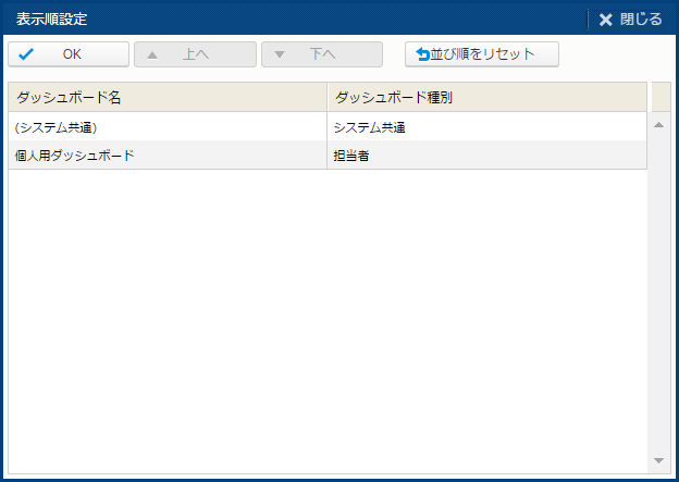 | 表示順設定 | ダッシュボードの表示順を設定する。クリックすると、[ダッシュボード表示順設定] サブウィンドウが表示される。 | ダッシュボード担当者編集権限 |