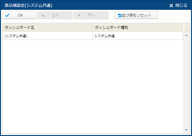 | 表示順設定(システム共通) | システム共通のダッシュボードの表示順を設定する。クリックすると、[ダッシュボード表示順設定(システム共通)] サブウィンドウが表示される。 | ダッシュボードシステム共通編集権限 |