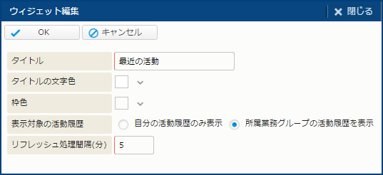 | 表示対象の活動履歴 | "自分の活動履歴のみ表示"、"所属業務グループの活動履歴を表示" のいずれかを選択する。 |