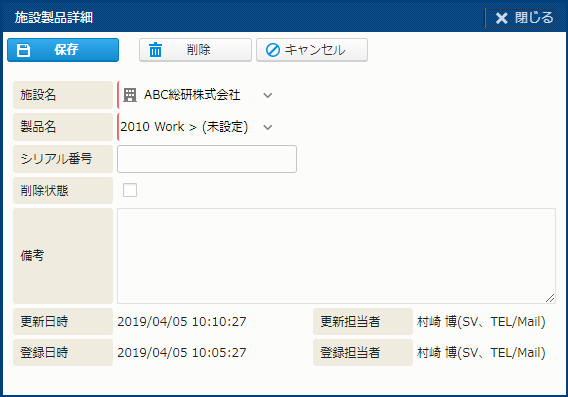 | 削除 | 施設製品を削除する。 | - |