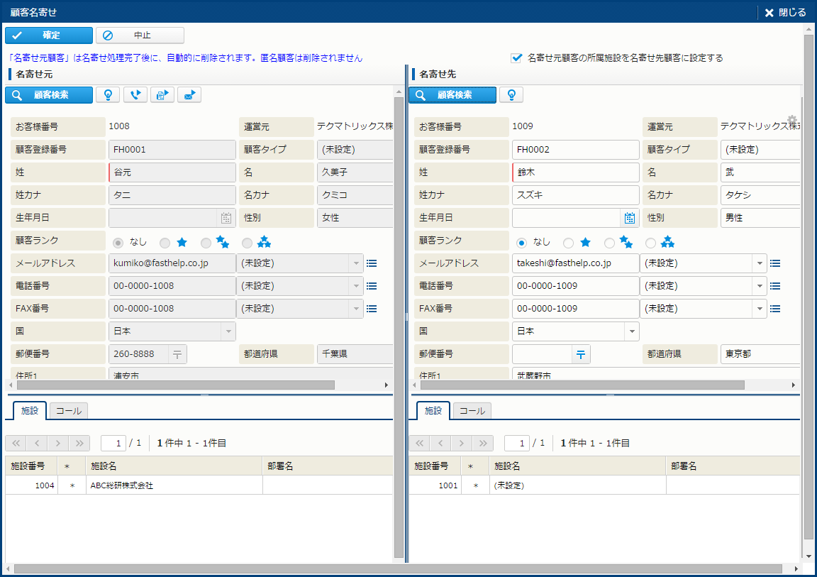 | FAX番号転記 | 名寄せ元顧客のFAX番号を名寄せ先に転記する。 | - |