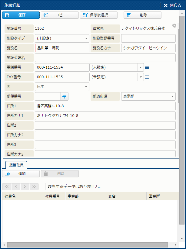 | FAX番号 | 施設のFAX番号。FAX番号数は動的に変更可能。 |