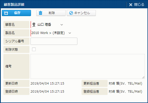 | 削除 | 顧客製品を削除する。 | - |
