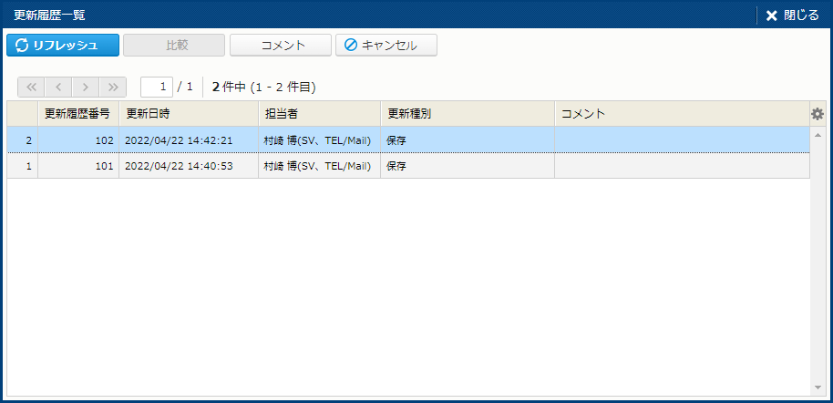 | 比較 | 2 件の更新履歴を選択すると表示されるボタン。2 つの更新履歴を比較する。[比較] サブウィンドウが表示される。 | - |