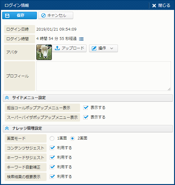 | ログイン情報 | 自分のログイン時間を表示する。自分のアバタの変更、サイドメニューで [担当コール] や [スーパーバイザ] をクリックした場合の動作 ("ポップアップを表示するかどうか") 変更、[ナレッジ管理] の動作変更も可能。クリックすると、[ログイン情報] サブウィンドウが表示される。 | - |