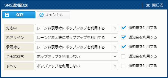 | 対応中 | ポップアップの利用場面について、"レーン非表示時にポップアップを利用する"、"常にポップアップを利用する"、"ポップアップを利用しない" のいずれかを選択する。 また、通知音も鳴らすには、[通知音を利用する] をチェックする。 |