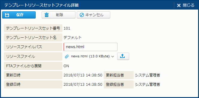 | 削除 | テンプレートリソースセットからファイルを削除する。 | - |