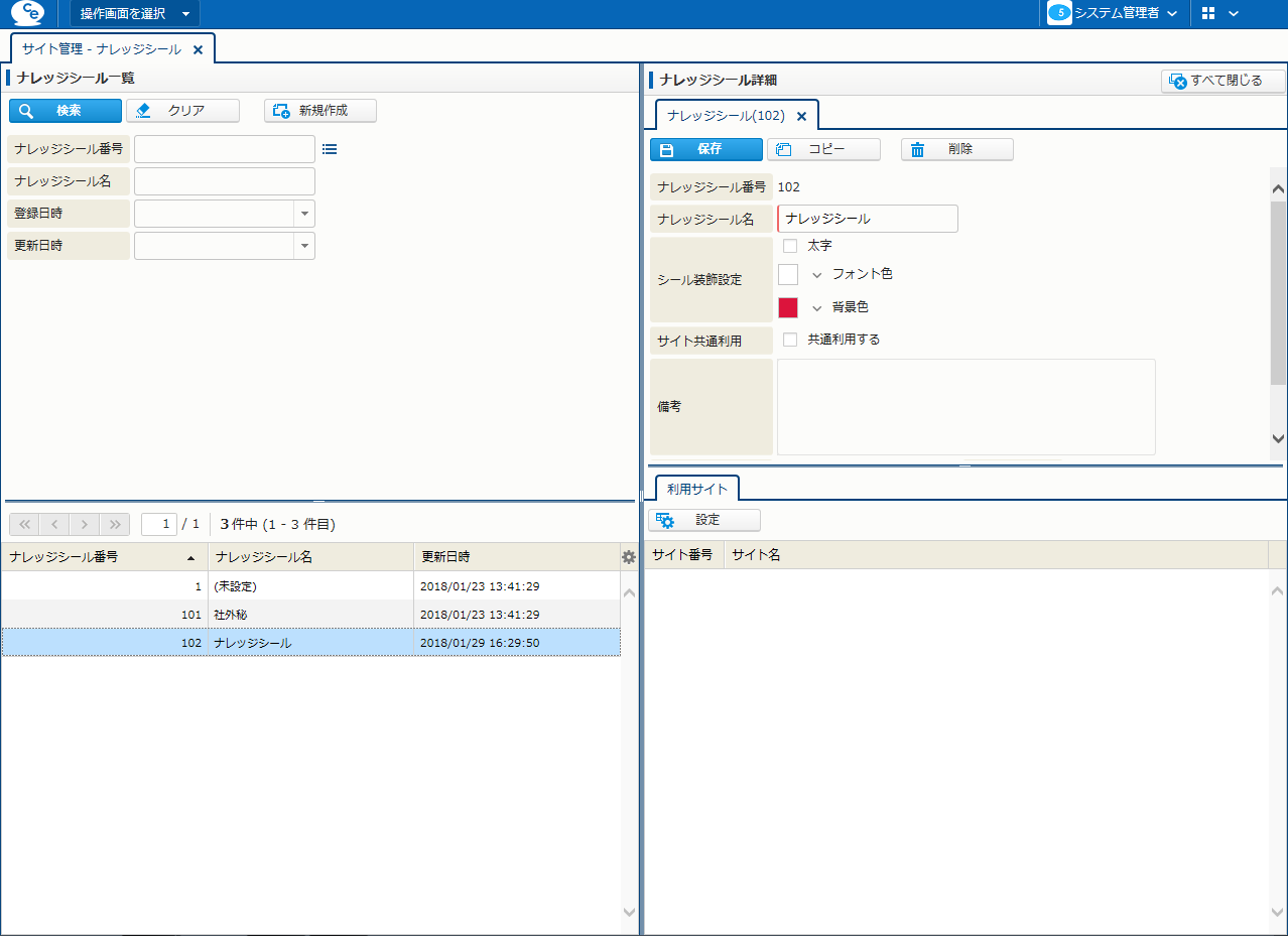| サイト共通利用 | - | チェックボックス | - | 共通利用フラグ。 オンにした場合、すべてのサイトでこのナレッジシールが利用可能となる。 |