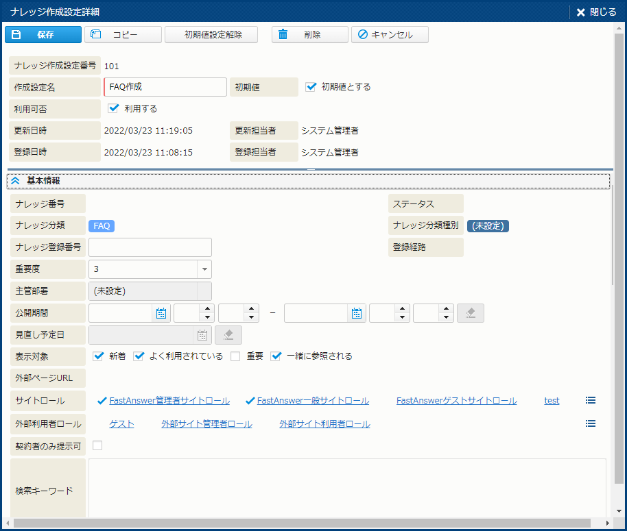 | 初期値 | - | - | - | 初期値として利用するナレッジ作成設定には "ON" と表示される。 |