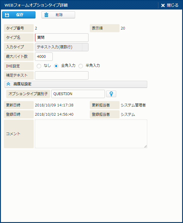 | IME設定 | 担当者が文字を入力する際に、IME を自動でオンにするかどうか、オンにする場合はそのモード ("全角入力"、"半角入力") を指定する。入力タイプに "テキスト入力" "テキストエリア入力" を選ぶと表示される。 |