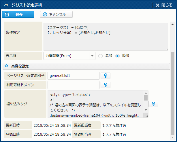| 埋め込みタグ | この一覧を表示するための HTML タグ。タグの内容をコピーし、表示させたいページに貼り付けることができる。 ユーザーの参考として表示される情報であるため、項目に表示されている内容は編集できない。 |