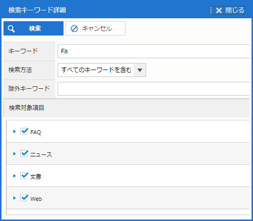| 検索方法 | "キーワード検索" と "自然文検索" のいずれかを選択する。また、"すべてのキーワードを含む" と "いずれかのキーワードを含む" が指定できる。 |