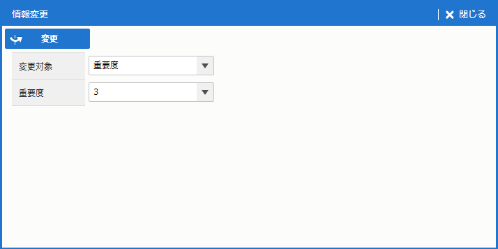 | 変更対象 | 変更対象を選択する。 "優先度"、"公開期間"、"表示対象"、"利用ロール"、"検索キーワード"、"検索タグ"、"カテゴリ"、"製品"、"ナレッジオプション" のいずれか。 選択した変更対象に応じて、変更内容を指定する項目が次に表示される。 |