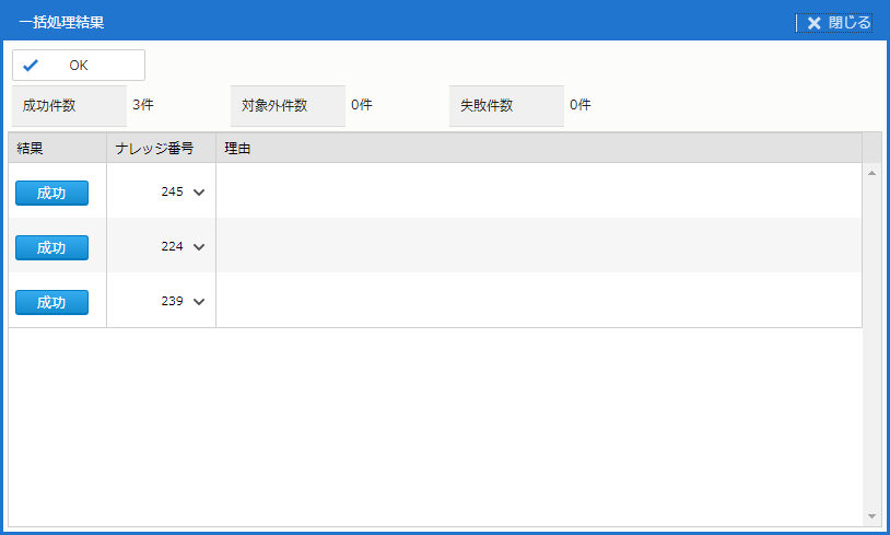 | ナレッジ番号 | 一括処理をしたナレッジのナレッジ番号。 |