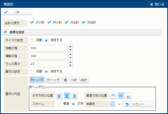 | 合計の表示 - 列小計 | 合計の表示に [列小計] を表示する場合は、ここをチェックする。 |
