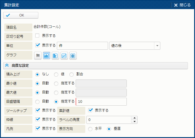 | 集計値 | - | チェックボックス | - | 集計値を表示する場合、チェックボックスをオンにする。 [グラフ] で "無" 以外を選択すると表示される。 |