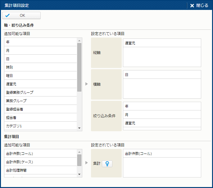 | 設定されている項目 | - | - | - | [集計項目] に現在設定している値。値をクリックすると、該当項目の削除や設定が可能。 |