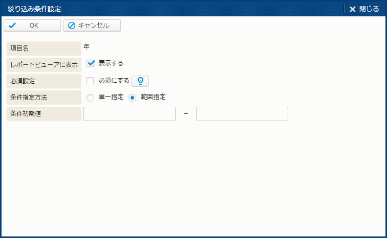 | レポートビューアに表示 | この絞り込み条件をレポートビューアに表示する場合に、チェックする。 |